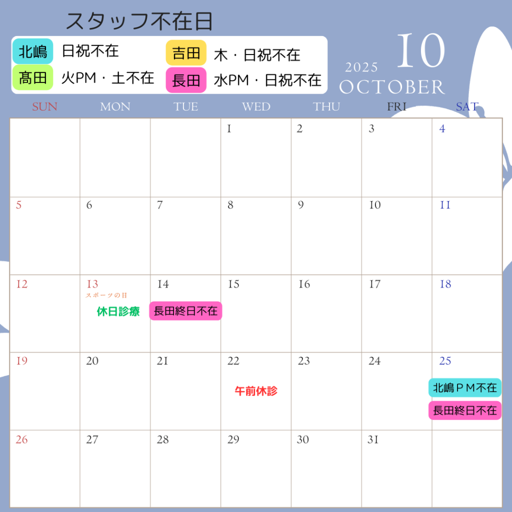 10月の営業日カレンダー 2025/09/29 10月は休まず営業しております。 25日(土)は午後から吉田1人の勤務となりますので、 電話やLINEの対応が少し遅れるかもしれません。 ご承知おきください。 < 前へ 前へ 一覧へ戻る > 一覧へ戻る