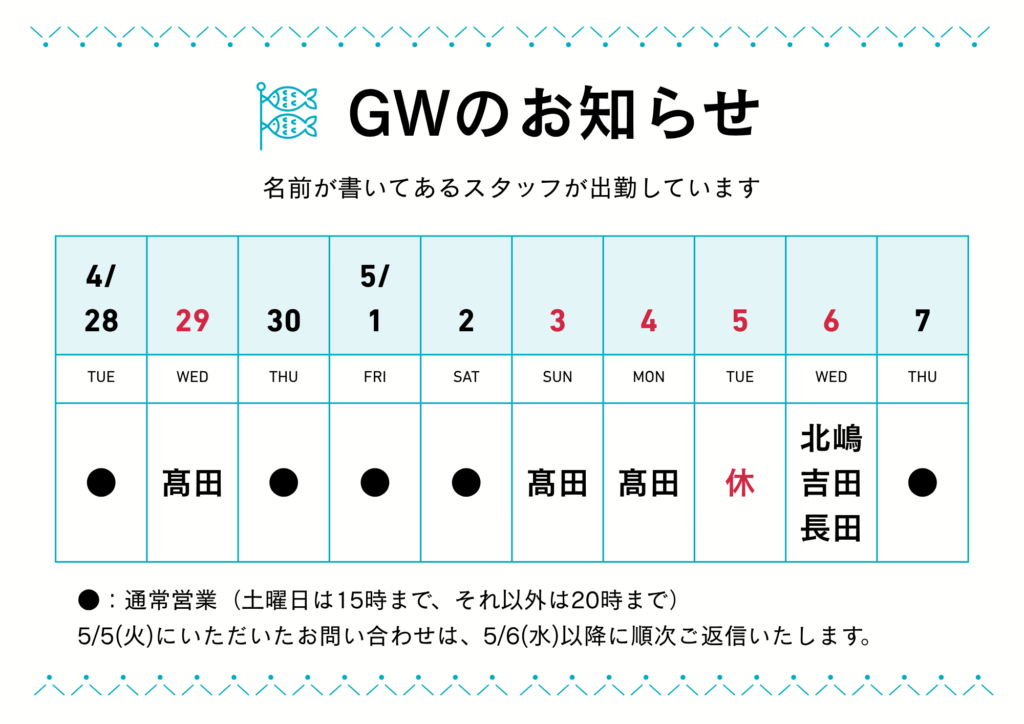 GW営業日のお知らせ 2026/04/27 もうすぐゴールデンウィークですね!琴似整骨院は、5/5(火)は完全休診日、それ以外は交代で出勤して院を開けています。「休みの日なのに、ぎっくり腰やっちゃった…」という時も安心してください。 < 前へ | 次へ > 前へ 次へ 一覧へ戻る > 一覧へ戻る