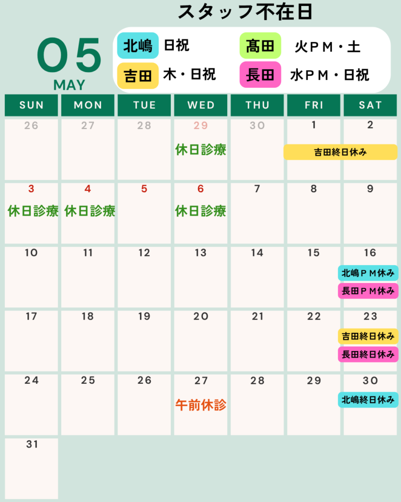 5月の営業日カレンダー 2026/04/27 GWに入ってしまう前に、5月の営業日カレンダー出せました!来月は運動会などあり、スタッフのお休みが増えます。休みの前後は予約が混雑しやすいため、早めのご予約がおすすめです。ご迷惑をおかけ致しますが、よろしくお願いします! < 前へ 前へ 一覧へ戻る > 一覧へ戻る